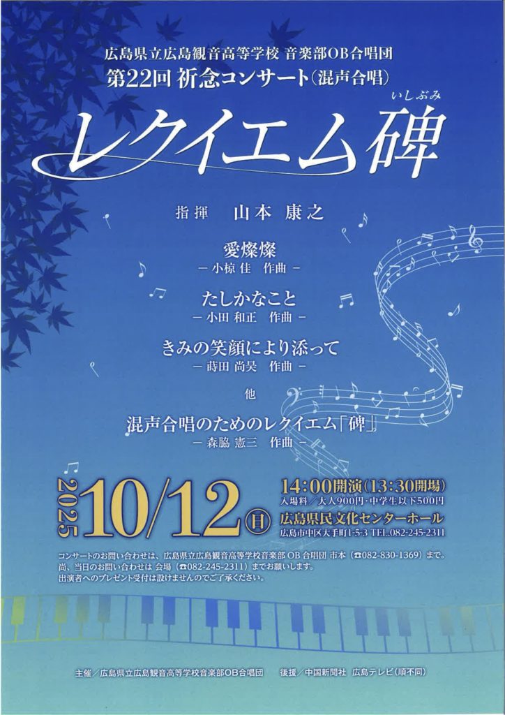 音楽部OB合唱団 祈念コンサート「レクイエム碑(いしぶみ)」のお知らせ お知らせ 2025.08.05 広島県立広島観音高等学校音楽部OB合唱団第21回祈念コンサート(混声合唱)「レクイエム碑」2025.10.12(日)14:00開演(13:30開場)入場料/大人900円・中学生以下500円広島県民文化センターホール広島市中区大手町1-5-3 TEL.082-245-2311