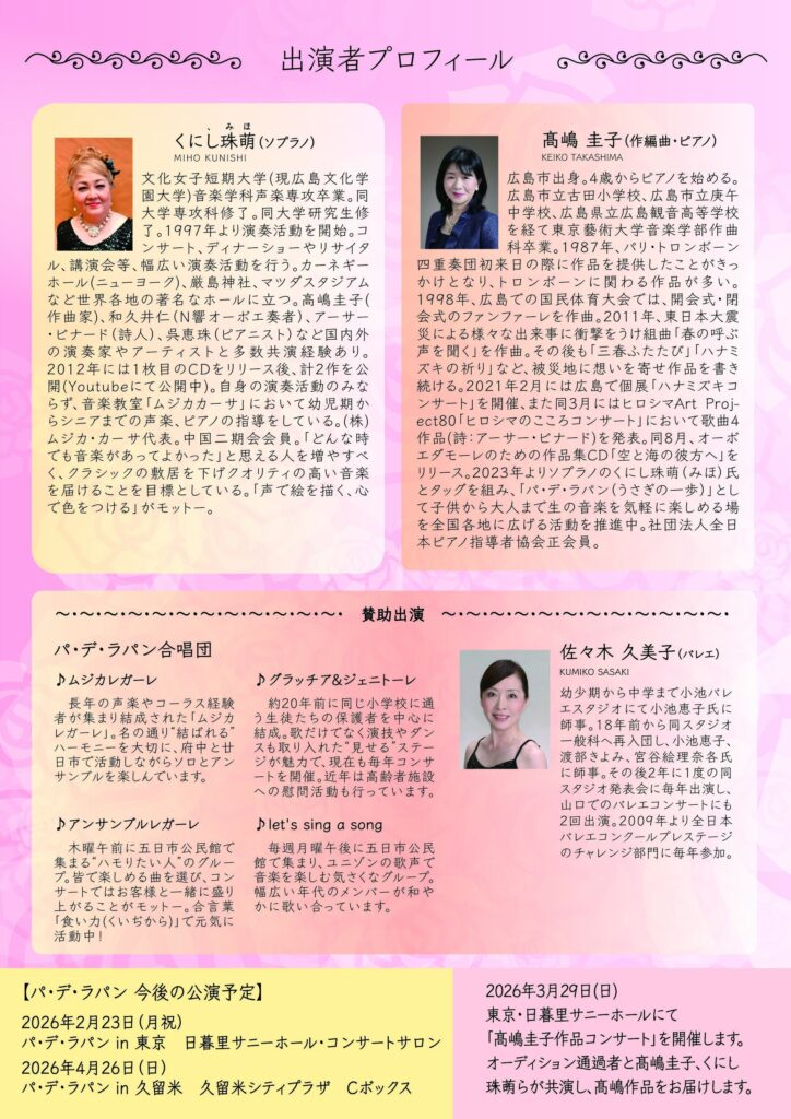 東京・久留米・広島で演奏活動を重ねてまいりました「パ・デ・ラパン・コンサート」。
